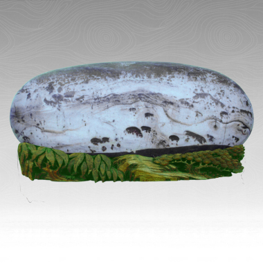 主人称这块石头上的画面是“天山脚下”,是的,远山近塬,牛马闲散,一派静谧。但也象草原,处处帐篷,也象林海雪原中的错落人家。我喜欢画面很难表现的整个呈现出的情调,底色为兰灰,物象黑而浅,这是在宣纸上很难表现的。 读石手稿