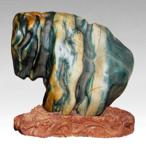 藏獒是中国的神犬,它不同于一般的猎狗,能吃若耐劳,勇敢凶猛,据说一条藏獒便可对付五条野狼。它也不同于一般的宠物狗,从不摇尾乞怜,以精忠报主为重任。这块黄河源头石,极似一只藏獒,其形高大精壮,黑白红绿各种颜色以条纹相间,即有皮毛质感,又整体华丽无比。它站在我们面前,没有睁目,没有纵耳,甚至安然得缩身垂首,但这正体现了藏獒的强大和力量。不怒自威才是王者,机灵的只是小免小鼠。 藏这样的石头,即能镇定,又能蓄养自己的气势。 读石手稿
