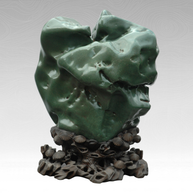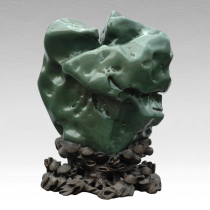 这块石头好处是颜色逼绿,质地光洁坚硬,正因为它不平面,也不圆润,疙疙瘩瘩着透发出势力,它雄沉大气。 如是一定要看出是个什么人或动物的造型,它似乎什么都不是,但看着就是喜爱。 什么家居风水?基本的标准就是你一进门,一切格局一切摆设觉得舒服就是好风水。石头就是石头,所赏石头要从最根本的对于石头的认识出发,才不致于本未倒置。 读石手稿