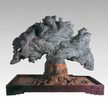 当今社会人人都想发财,所以这块石头被叫做发财树,据说价格标得非常高。 我看重的只是它的树形。灵壁石种常常形成各种形态,又因质地拙朴而被人喜爱,但像树形的却是极少见。这块石树叶冠浑然,布局均称,犹如平原上独立之木。独立之木不像深山中的群木,为争夺高空而细而高或歪七扭八,它生存自在,因之桩粗杆壮,叶冠如厚云,有王者风范。 这么大的一棵树,四面八方的风是吹不倒的,又有包容性,朝朝暮暮放飞和吸收群鸟。 道积宣蒙福,德盛利斯长,从这点讲,也就可以称作是发财树吧。 读石手稿