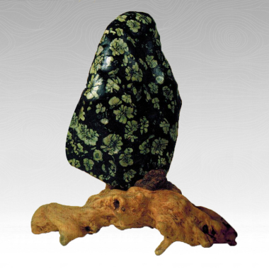 石是黑石,花是白花:石在朴素中见绚丽,花在无序中求均匀。 1995年秋,有河南人运来- - 批这样的石头,求李饶推销,河南是产牡丹的地方,但石头通体有牡丹花纹,使李饶也惊奇。遂召呼石友来购,没有不乘兴面来,得意面归的。石头是一钱不值,干金难买之 石面一-时囊涩之友。 某人就幸得所赠一石,形如巨大馒头,满满当当盛于-浅底窄沿大白瓷盘,放置厅中几案上。家有客来,先一日是位教授。间:这顶毡帽在哪儿买的?三日后,一老太太来,说:你家还有印花土布啊!伸手去抓布,抓不起,才知道错了,锐声尖叫世上还有这种石头?! 入冬,一日同李饶乘车进城,李饶忽叫:“石头!”看时,车窗外一女人身穿印花布大棉袄行走,e缩着头, 咕咕涌涌的, 猛想起他家此石,不觉哑然失笑:人穿印花布,石也穿印花布,或许,李饶不在。这石头就悄情进城逛街了? 藏家简介