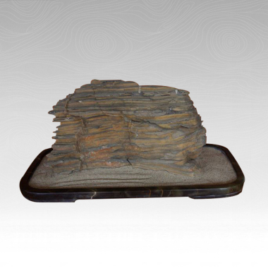 千层石:也称积层岩,属于海相沉积的结晶白云岩,石质坚硬致密,外表有很薄的风化层,比较软;石上纹理清晰,多呈凹凸、平直状,具有一定的韵律,线条流畅,时有波折、起伏;颜色呈灰黑、灰白、灰、棕相间,其棕色稍显突,色泽与纹理比较协调,显得自然、光洁;造型奇特,变化多端,多有山形、台洞形等自然景观,亦有宝塔形、立柱形及人物、动物等形象,既有具象又有抽象,神韵秀丽静美、淡雅端庄。 产品特点
