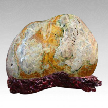 噶巴石,亦称酒泉彩玉,产于甘肃省酒泉市红水坝河及其冲积滩砾石层中。该石为玉质卵石,质地坚硬凝腻,硬度6.5以上。肌理晶莹,微透明,玻璃光泽或油脂光泽,呈嫩黄、深碧等色,间有松花纹理。体量较大,浑厚古朴。其图纹石多以绿色为基调,嵌墨绿、翠绿、鹅黄、雪白等色纹,偶有红、褐、紫等浸染色,构成崇山峻岭,江河飞瀑,大漠流云等自然画面。 产品特点