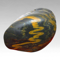 汉中金带石是缠满金色带子的黑卵石,由滔滔汉江千万年的冲刷和滋养而形成,磨圆度较好,水洗度佳,所呈图纹有具象美和艺术美,深沉凝重、古朴典雅,别具特色。 |