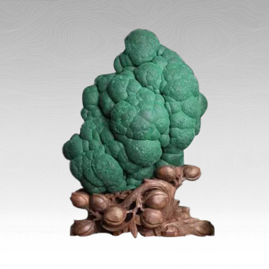 早在4000年前,古埃及人就开采了苏伊士和西奈之间的矿山,利用孔雀石作为儿童的护身符,驱除邪恶的灵魂。在德国,人们认为佩戴孔雀石的人可以避免死亡的威胁。中国公元前十三世纪殷代已有孔雀石石簪工艺品。 黄石孔雀石,绝大多数来之于大冶铜录山,将它们置于陋室中,于是,斗室和我全裹"孔雀绿"的幽光下了, 纵然窗外暑气逼人,却有"满室岚气"生清秋的感觉,眼前顿时有了浓密柳荫下泛碧的一泓春水,有了一座苍凉夕照里葱郁的翠峰。我的藏石孔雀石有庄重典雅的《普渡众生》、可爱珍贵的《丝方尽》、热烈浓艳的《春》《秋》《冬》流光溢彩的《雏莺鸣翠》…… |