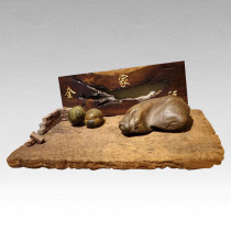 本组作品选用的三个组件都为广西水冲石。组件一,是一方十分出形的水冲石。趴卧着的猪妈妈,石色黄褐色,石肤略有粗糙,无论是形,还是色,都与猪的形象很贴切。组件二和三,石色一为黄褐色一为翠绿色,石肤细腻光滑,为两个猪宝宝形象。石形圆润饱满,恰到好处地表现了猪宝宝的憨态可掬与活泼可爱。 特点应用 三个组件的综合条件都很☆,形、色、神都很到位。且组件一体量大于组件二、三一倍有余,三者比例协调。 藏家以半围红砖暗指猪圈儿,将三石置于一局。圈儿中,猪妈妈趴卧在一旁,默默地注视着两个调皮的猪宝宝在一起玩耍。 作品启示 值得注意的是,藏家将组件二、三交叉陈设,这样既照顾到正面观赏的展陈效果,也照顾到了侧面观赏者的观赏体验。 |