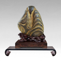 纹,作为最具意象发挥思维空间的原石自然因素。在大湾纹石中,纹的多少和柔顺程度,是确定石之优劣的主要条件。 这件大湾纹石,纹样清晰,集中分布于两石之两侧,似锦缎,柔顺有致。石之中轴线顶部一深色色块悄然交待出一个人物的头部形象,便整体形成了一个简约而形象的人物形态。 沿头部而下,有趣的黑色悄然而下,越收越巧,巧得形成了一撮人物的胡须。石之两侧的纹样自然而然便成了服饰,飘逸朴素而不失典雅,一派仙风道骨的人物形象跃然而出。 该石石体形态整体细节精彩,尤其是纹路与人物头部及胸前留白的充分搭配组合,对这一仙风道骨的人物形象确立起重要作用。 |