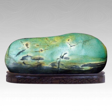 石头翠绿为底,灰黑为纹。我们若将翠绿底色看作留白,则那灰黑的纹理,就是一幅水墨国画了。灰黑色块浓浓淡淡,“墨分五彩”,块块斑斑,点染勾描;构图随意又见匠心,可谓大家之作。 画中几片荷叶,有的浮于水面,有的举高摇曳;前景一叶长长的水草,似还歇着一只大蜻蜓。好美的一幅墨荷图! 图中之荷,荷叶略显稀疏,不见荷花,看来不是盛夏之荷。那么它是深秋的残荷,还是阳春的新荷呢?画中未见一枝莲蓬,应非秋荷,而是春荷无疑了。 大概,“画家”担心我们这些凡夫俗子,难以看懂他画中表现的春天气息,于是灵机一动,把大片的留白染成了鲜艳的翠绿,于是春天的氛围,就凸显出来,令人一望而知了——这就是这块石头,如何被“画家”刻意表现“春天”主题的“故事”! 当然,观赏这块石头,看到它的题名,你可以立时在你的耳畔,响起歌星董文华那深情、动听的歌声:“春天的故事……春天的故事……一九七九年……”或者用你的歌喉,从你的心中,唱出同样深情、动听的歌声! |