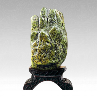 佛手若磐,金光耀眼。昔悟空大闹天宫,众神哗然。一个筋斗四万八千里却未曾跳出三界之外,怪不得这佛手上四海五岳俱显。 佛手曾拈花,佛祖静默不语,众僧愕然,唯迦叶摩珂微笑开颜,造就了禅宗公案故事之渊源,怪不得这佛手上有莲瓣展艳。 佛手合掌,立普济万民之心于胸前,众生欣然。小乘渡己,大乘渡人,极乐世界风光隽,怪不得这佛手皴皱之上尽凹点,缘来是一点许诺众生一万愿! 赞曰: 人皆有佛性,赏石佛自现。 极乐在审美,物我相融玄。 |