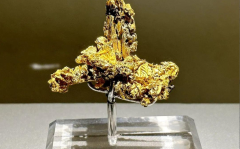 自然金化学式:Au 产地:四川省自然金,一种产自矿床或砂矿的金元素矿物,金黄色,具有金属光泽,为贵金属,可提取黄金。早在石器时代,石头是先民在生产劳动中最熟悉的材料,现代生活中的刀斧锤锛等工具,都能在石器时代找到它们的祖型。见得多了,先民就对石和石器的质地、色彩、造型、纹饰、神韵、用途等,逐渐有了更加细微的感知和关注。伴随着旧石器时代末期玉、石分化观念的出现,对石的观赏意识悄然萌发,甚至催生了原始的神石崇拜。异极矿化学式:Zn4Si2O7(OH)2·H2O 产地:云南省异极矿是一种硅酸盐矿物,是重要的锌矿物,主要形成