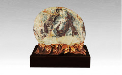 在汹涌澎湃的江边上,男女主人公面面相觑。女的发髻向后,裙带飘逸,如皇室之妃;男的身材魁梧,气宇轩昂,像盖世英雄。人道是:西楚霸王项羽和他的爱妃虞姬也!