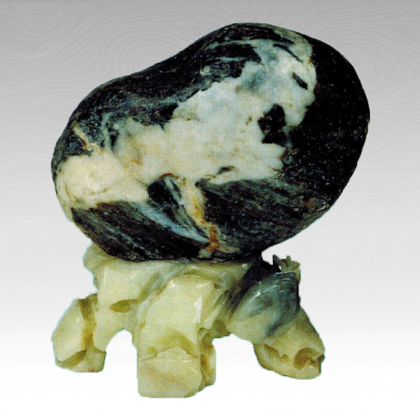 在李饶收集奇石的经验中,常常是得一便可获二,尤其那些纹理石。那年捡到一只“奔牛”,不久即又捡到一只“卧牛”,捡到了“日上船出海”,就又捡到“月下憎献门”。1989 年在泾河滩猎一“编羊”石后,心想:还会有一“山羊”来的,但处处留心,却无踪影,自己也看着“组羊”发呆,耳里似乎是一声声的“昨吓”叫。到了1990年,随同老干处组织的参观旅游团往西双版纳,一路每到一处,首先就寻找奇石异矿,但毫无收获。从昆明到西双版纳,乘车式天,下午4时赶到,住在了靠近潮沧江岸的一个地质队分队部,心里总慌慌的。夜里睡下,又觉得耳里似有“晖晖”之声,天未亮就起来,独自去江滩了。当捡到这块“山单”,仰天长笑,说:“我的羊跑到这儿来了!”