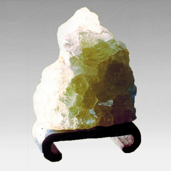 萤石属品型观赏石,为等轴晶系。单品晶体多称立方体,少数成八面体及菱形十二面体。品簇常见块状,颜色有紫、绿、褐色,玻璃光泽,性脆。这方萤石绿面透明,参加过无数次奇石展出,只要展室稍有光线,就在众多的展品中极显眼夺目,若在花中,是亮丽的月季,若在人中,则是美艳的少妇了。