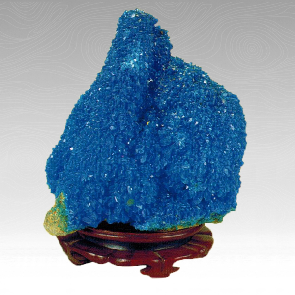 在李饶的集石历史上.此石是专门乘生飞机去贵阳购回的。此石的价值在于历来的藏石家们未曾见到过。这些鲜蓝色的,有城璃光泽的品体,依浮在钟乳石上它的主面成分是铜,同时又含镁和锌,硬度2.5.比重3,是含铜硫化物的产物。