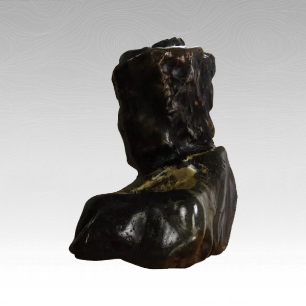 唐代高僧“祖师公”,是闽南、台湾及东南亚华人敬仰的第一医药之神。佛学造诣达到“妙悟空中,深了无碍”的境界。他医术精湛,广恩普济,亲手建立了平和“三坪寺”,曾被唐懿宗赦封为“广济大师”。仔细端详,祖师公头戴佛冠,颈佩佛珠,天庭开阔,面容慈善,眼神深遂庄重;他大耳垂肩,肩宽膀壮,肌肤似经千年香火熏照而呈紫铜色,神奇应验了“塔殿”楹联中的谶语:“一尘不染千年塔,万丈难磨半圣身”。王先生亦喜亦梦,他拜见了“祖师公”, 连夜毕恭毕敬地把祖师公请回家。同是虔诚信徒的妻子啧啧称奇,王先生见状方如大梦初醒。传说开天眼的人,能见人所不能见,修行越高,悟性越深,也许这都在一个“缘”字。而王石痴与祖师公的心神相会,不知是他与奇石的缘,还是与佛祖的缘呢?