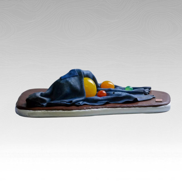 作品是以泥塑的蓝色麻布料为配角。蓝色麻布料在古代是普通庶民的专属,在现代是蓝领百姓的代表,冷峻粗犷的质感,与艳美的宝珠形成强烈对比。