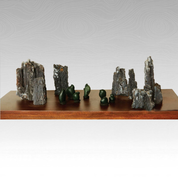 选好同样为七数的石林材料编号之后,用太空泥临时配座,置于意象中台板大小的白纸上,分为左右两组,大小搭配,高低错落,力求自然和谐。然后将设计图纸和石林材料交配座的石友打孔并安放台板,未几,效法云南石林的景观即成。然后将以黑色太空泥为座的绿碧玉七贤,或站或坐,率性自在地置于石林的空地之上,完成了这局小品石组合的陈设创作。