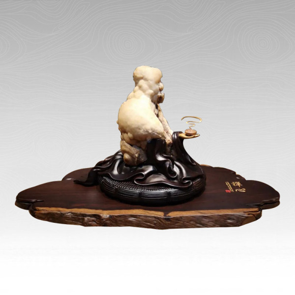 对于这类需要“补缺”的石头来说,正常的手法是通过台座塑形来补足形象。但是如果仅仅停留在这个阶段,显然是不够的。好的台座设计,不光是“弥补”,而且是“延展”。