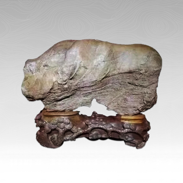 “鬼斧神功造奇石,千姿百态竞无穷。“山东临朐紫金石距今已约有4.5~5亿年的生成史,非常具备当今”形、质、色、纹、韵”的观赏石要求和标准。其形干姿百态;其质温润如玉;其色瑰丽璀璨;其纹清晰如雕;其韵耐人寻味;不愧为近期观赏石品种的一匹"黑马”。该《金牛迎春》系山东临朐紫金石,以形取胜,色泽富贵华丽,观其如一头辛勤耕耘、勇于开拓的老黄牛;头、眼、嘴、鼻、身、鸭、尾等清晰可观,石表凹凸起伏,营造出骨架结构完整,肌肉张弛有力的视觉美感。赋名"金牛迎春”,寓意吉祥,讴歌牛吃苦耐劳和拼搏奉献之精神。“一牛在厅,牛势冲天。"庇佑藏石、赏石人扭(牛)转乾坤,前程似锦。