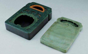 北宋苏易简在《砚谱叙事》中说,昔黄帝得玉-一钮,治为墨海焉,其上篆文曰‘帝鸿氏之研。黄帝时代距今5500余年,这大概是赏石文化中最早关于砚的记载。1958年,西安半坡仰韶文化遗址,发掘出相当数量的彩陶器,同时出士了一件双格石砚,槽里面还残留着红色的矿物颜料。1979年,陕西临潼县姜寨文化遗址,出土了一套完整的↓绘画工具,其中有件带有盖板的石砚,砚的凹槽里搁着磨棒和几块黑色颜料。这些实物保存在陕西博物馆。从这里可以看出,墨砚的起源是研磨器,滥觞于新石器时期(大约6000年前)的彩绘器皿。1976年, 殷墟妇好墓出土的商代
