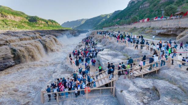 国庆期间,观赏壶口瀑布、观看民族抗战史诗剧《黄河大合唱》已成为游客的必打卡项目,每次演出结束后,游客们都会自发起立,和走下舞台的演员们齐声合唱《保卫黄河》,共同唱响爱国旋律。